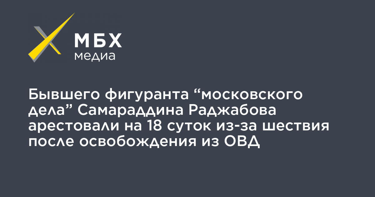 Пресненский суд Москвы арестовал на 18 суток бывшего фигуранта «московского дела» Самариддина Раджабова из-за шествия после освобождения из ОВД 5 июня. Об этом сообщает корреспондент «МБХ медиа».