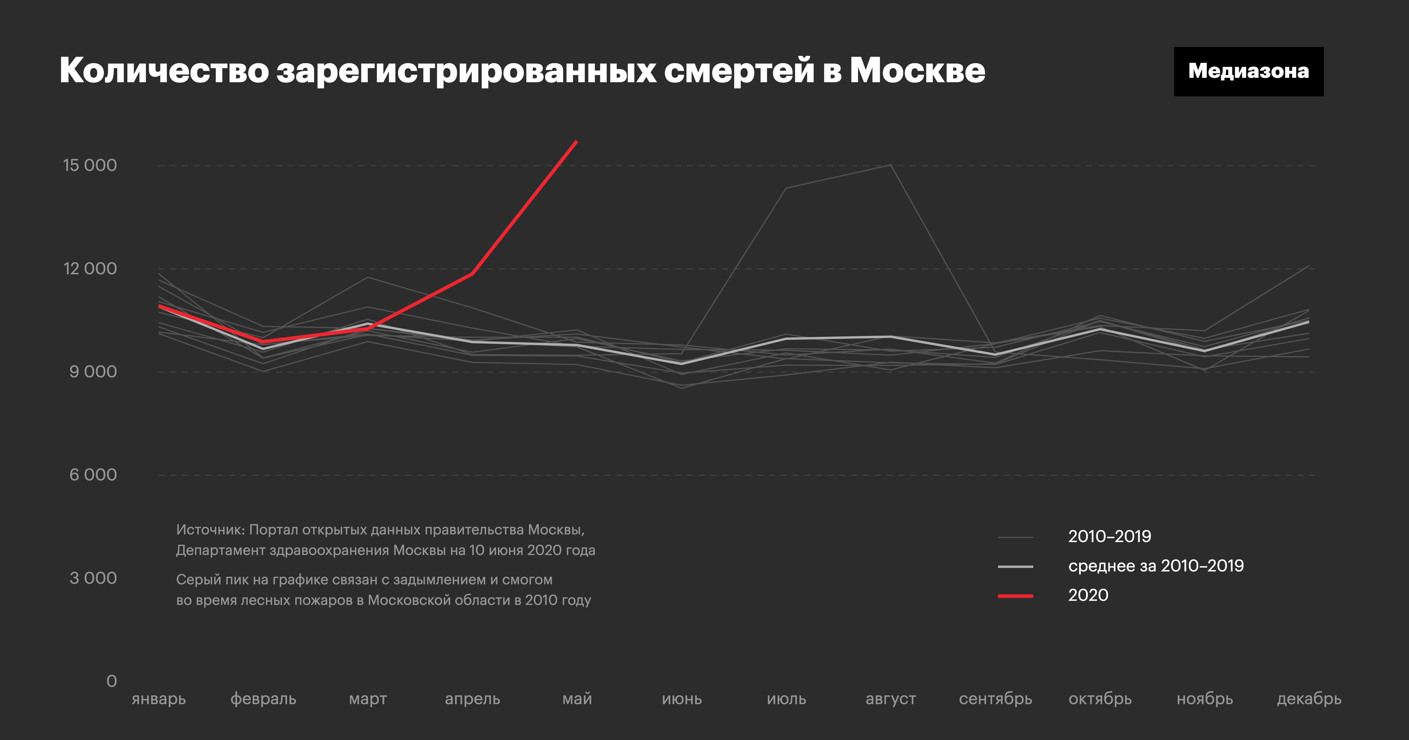 По подсчетам «Медиазоны», среднее число смертей в мае за последние 10 лет составило 9 777. В этом году за этот месяц умерло на 5 936 человек больше.