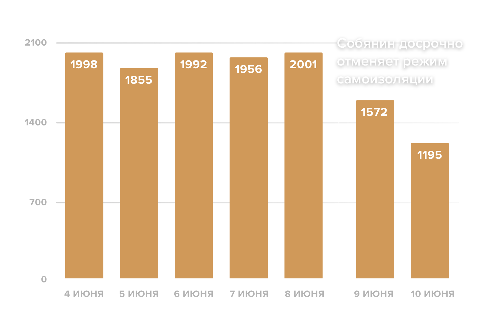 Мэр Москвы Сергей Собянин 8 июня объявил о досрочной отмене режима самоизоляции в городе — по данным источников «Медузы», это было сделано ради улучшения результатов на голосовании по поправкам в Конституцию после разговора Собянина с Владимиром Путиным. После этого количество новых ежедневных случаев заболевания в городе, до того на протяжении недели державшееся на уровне около двух тысяч, резко снизилось.