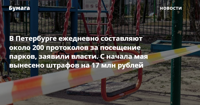 Штраф за посещение парков и детских площадок в Петербурге составляет от 4 до 5 тысяч рублей. При этом с конца мая петербуржцы не выдерживают ограничений и выходят на улицу, в том числе в парки. «Бумага» публиковала фотографии с Марсова поля, набережной Карповки и Крестовского острова, где 26 мая собрались десятки людей.