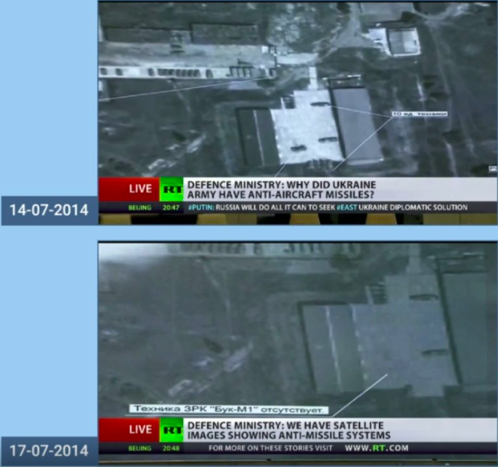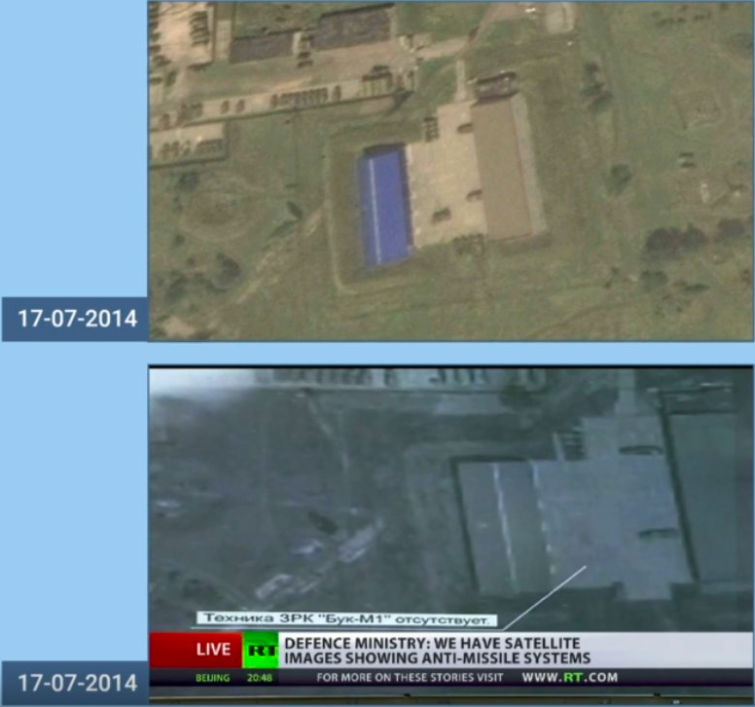 В подтверждение того, что эти «Буки» украинские, Кремль показал спутниковые снимки украинской базы. На снимке от 14 июля, как сообщается, «Бук» есть, на втором, от 17 июля — уже нет.