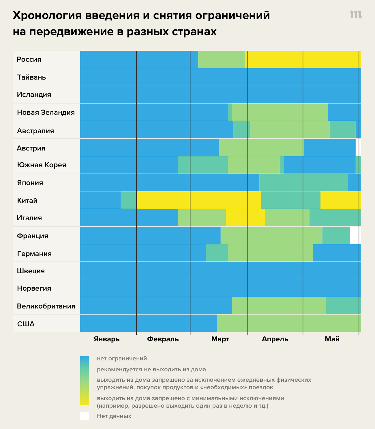 В России, по данным Фергюсона и соавторов, связь между уровнем мобильности, заболеваемости и смертности не нарушена; мобильность в стране была ниже порога в 68% в апреле — после того, как власти ввели ограничительные меры. В начале мая, когда Владимир Путин объявил об окончании «нерабочих дней», мобильность вновь выросла, хотя формально после этого уровень государственных ограничений, по данным оксфордского трекера, существенно не менялся еще несколько недель; с тех пор Россия не возвращалась на уровень порога в 68%. То есть в мае карантинные меры оставались относительно жесткими, но их стали хуже соблюдать.