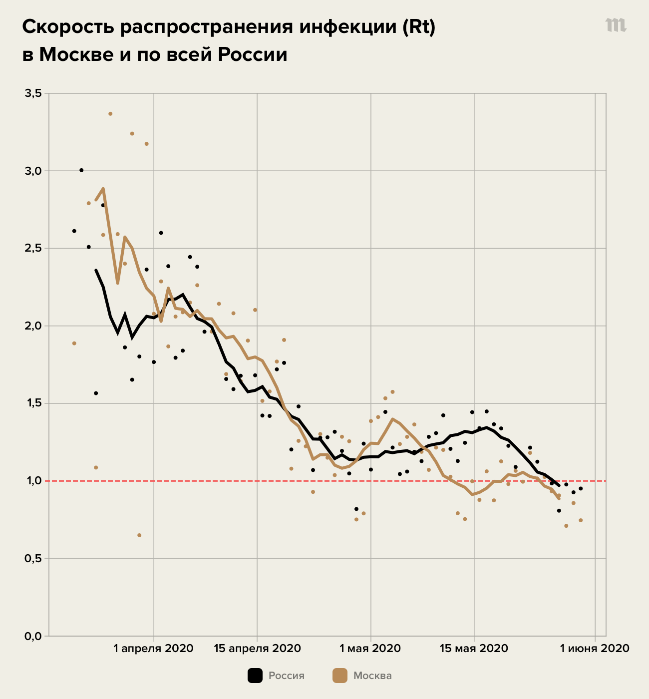 Власти города 10 июня опубликовали данные об избыточной смертности за май. Согласно им, реально умерших из-за заражения коронавирусом больше тех, кто попал в официальную статистику, примерно в 2,8 раза. Такое же соотношение было и в апреле. Таким образом, можно относительно точно определить Rt в городе. Но, увы, нельзя сказать, как именно ведет себя эпидемия прямо сейчас: задержка от момента регистрации случаев до смерти составляет 10–15 дней, а от момента заражения — и вовсе 20–22 дня.
