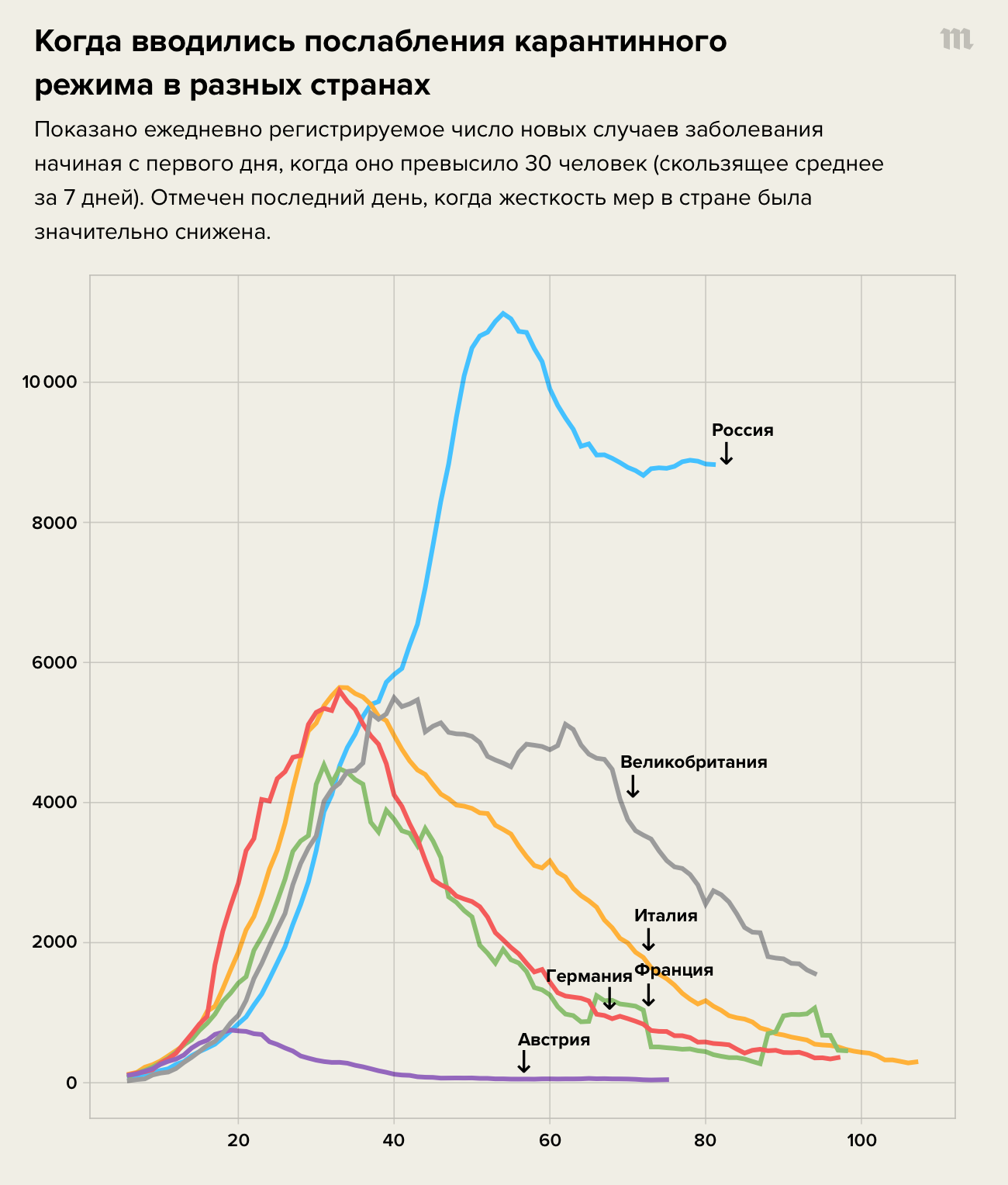 Москва обещает открыть рестораны и бары одновременно с Лондоном, в целом по темпам ослабления карантина российская столица опережает британскую. Разница в том, что в Москве каждый день регистрируется несколько десятков смертей, а ежедневное число умерших (которое прямо связано с числом реально заразившихся с задержкой в три недели) снижается крайне медленно. В Лондоне количество ежедневных смертей за последние недели резко снизилось; 8 июня в столице Великобритании от коронавируса не умер ни один человек. За слишком быстрое снятие ограничений критикуют власти Нью-Йорка, который по степени снятия ограничений отстает от Москвы, количество ежедневных смертей там снизилось на порядки (теперь их меньше, чем в российской столице).
