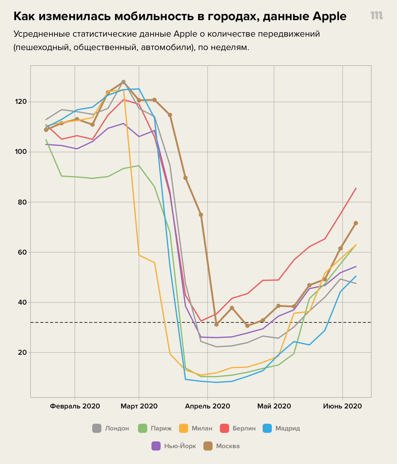 Команда знаменитого эпидемиолога Нила Фергюсона из Имперского колледжа в Лондоне 8 июня выпустила исследование, в котором обсуждается корреляция данных Apple (а также Google, данные которого недоступны для России и Китая) с темпами роста заболеваемости и смертности. Проще говоря, ученые выявили, как общедоступные данные мобильных компаний отображают эффективность карантина. По данным Фергюсона, эпидемия в стране идет на спад, если мобильность «по Apple» снижается на 68% (59% «по Google») по сравнению с «довирусными» временами. Установлена четкая корреляция этого порога и со смертями от коронавируса — они быстро снижаются через три недели после того, как мобильность уменьшается на 68%.