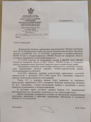 Пресс-служба УФСИН России по Самарской области в ответ на предыдущую публикацию ОВД-Инфо про Рыжова направила нашей редакции свою версию ситуации с болезнью Рыжова. По мнению ведомства, часть информации о Рыжове не соответствует действительности.