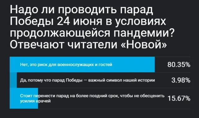 Гораздо большую эпидемиологическую опасность, на мой взгляд, представляют народные гуляния. Как будут организованы люди, которые будут смотреть парад и после этого массово ликовать по поводу Победы, добытой три четверти века назад? Этот вопрос лично меня беспокоит больше всего.