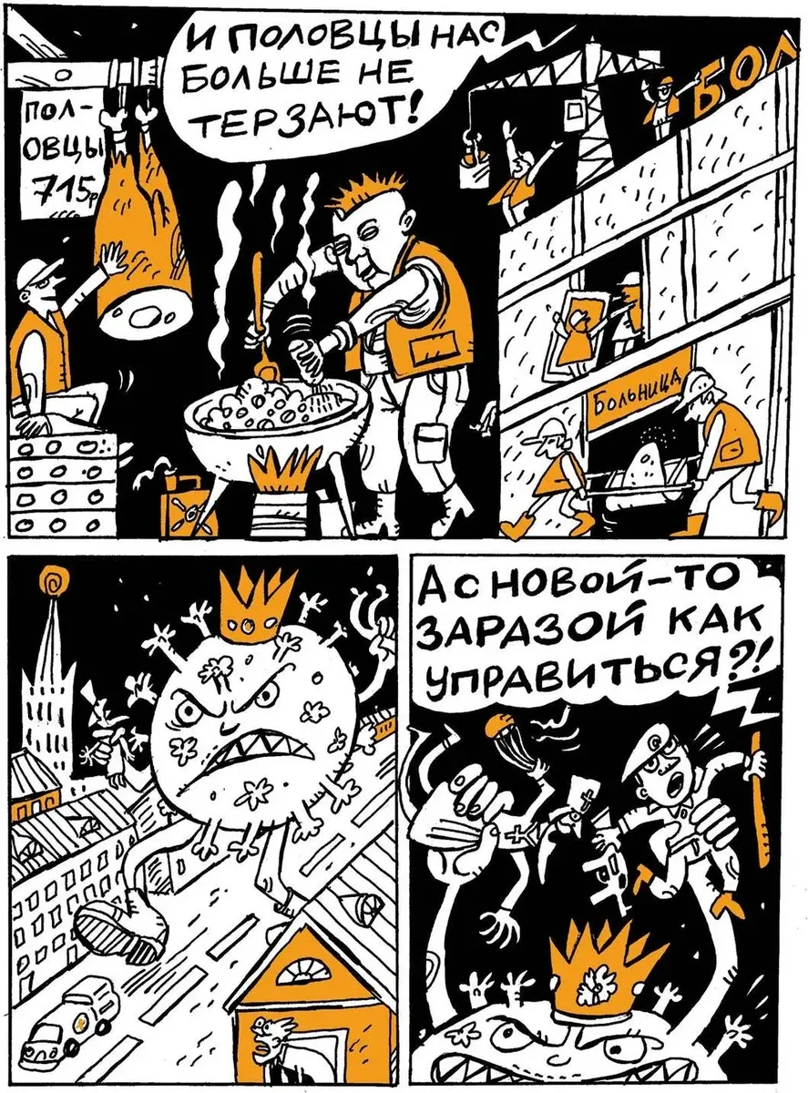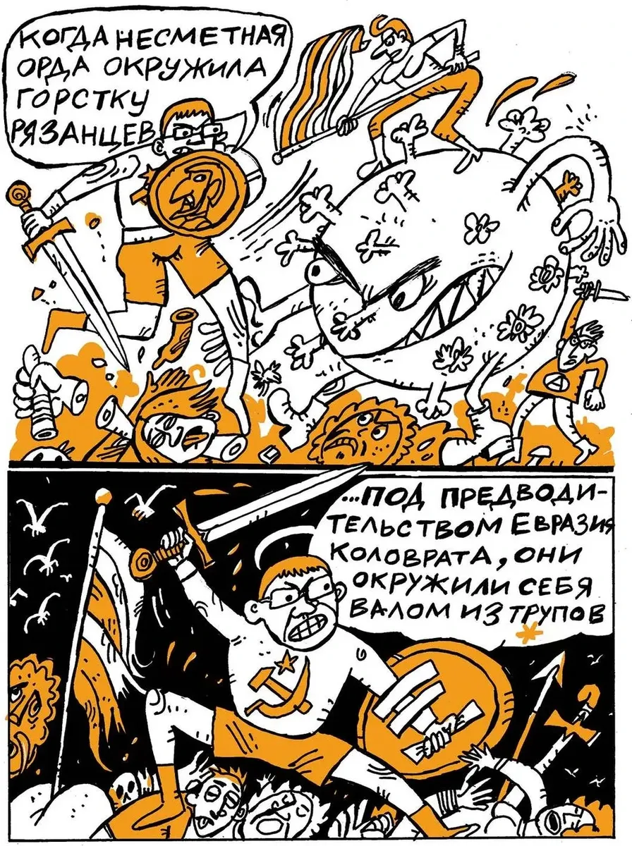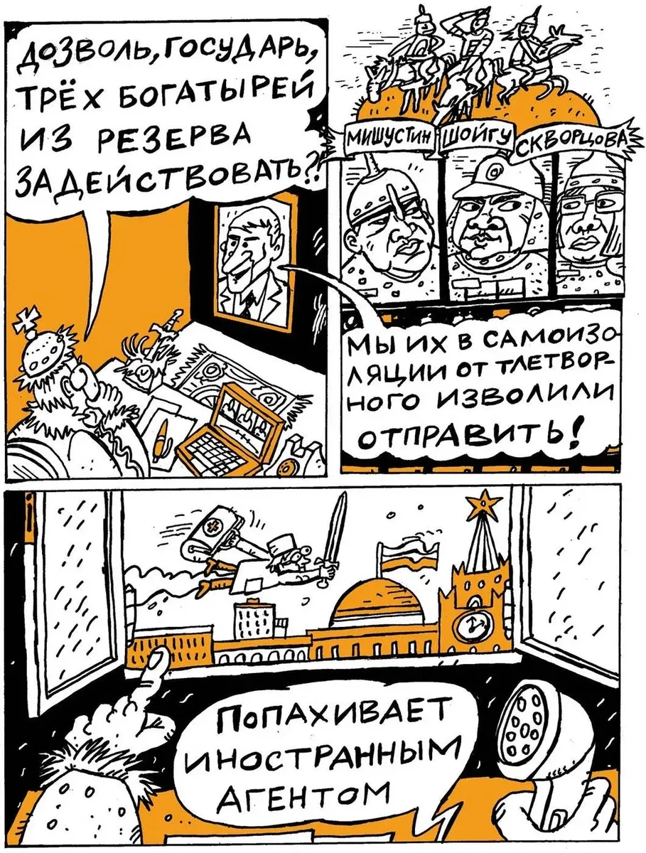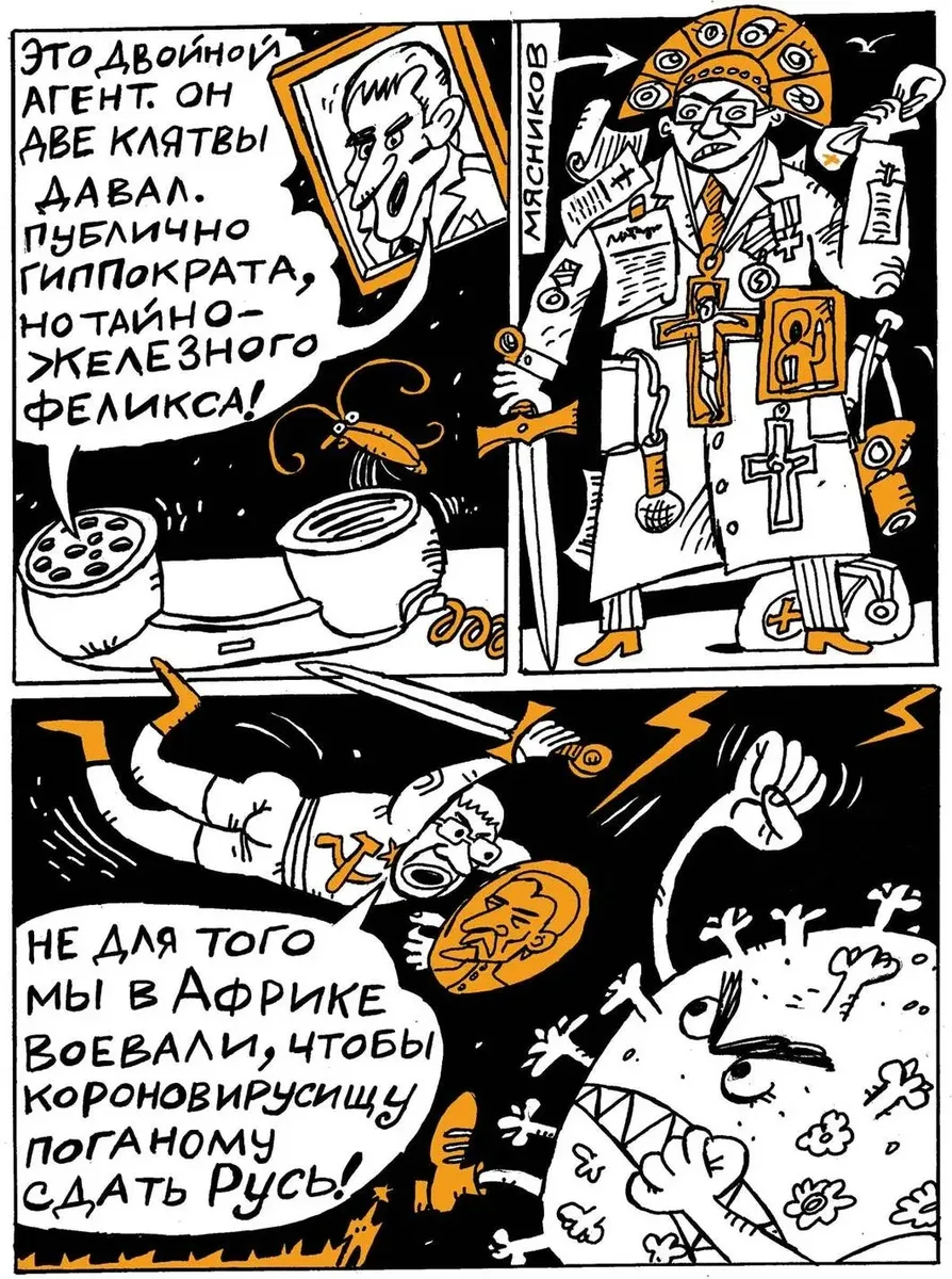 Велика Россия, да и Ковид-разбойник — басурман великий: не слушается он светлого князя Сергея Семеновича, не покидает Русь, все разорения да мор учиняет. Проект «Кафка-Zаговор» выяснил: только доктор Александр Мясников готов применить силушку богатырскую да покончить с иностранным агентом. Но современная медицина уже вызывает Мясникова на дуэль (читайте комментарий Ярослава Ашихмина к комиксу).