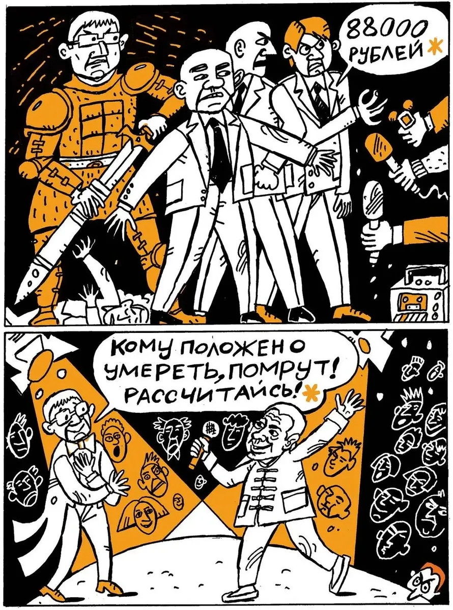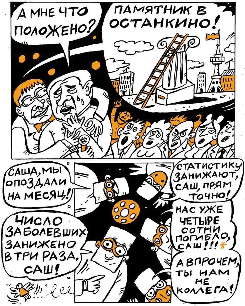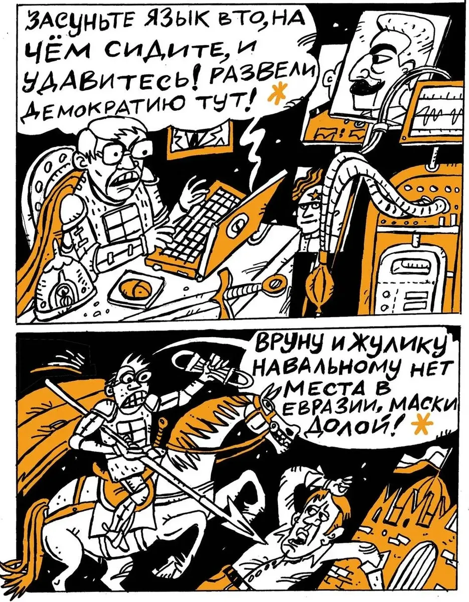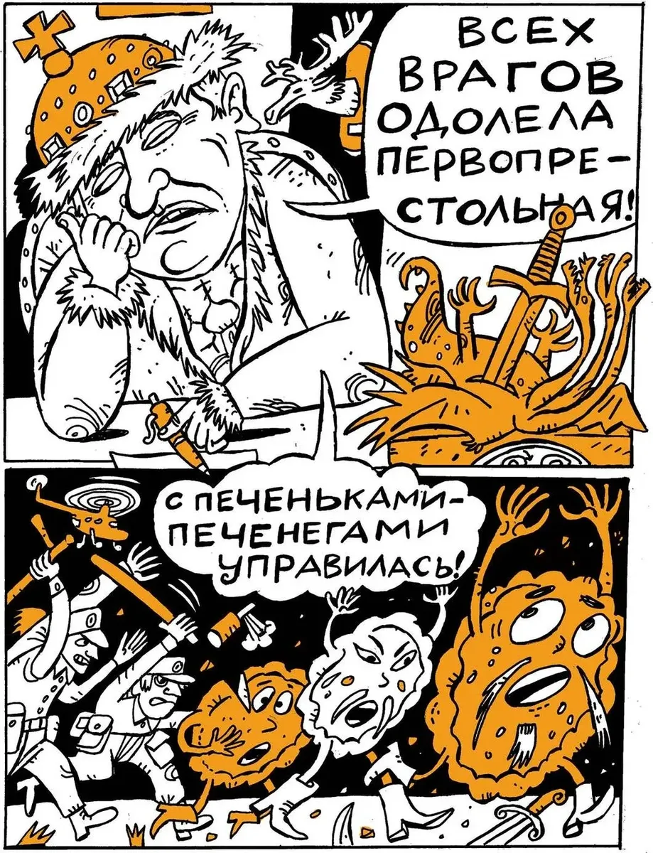 Велика Россия, да и Ковид-разбойник — басурман великий: не слушается он светлого князя Сергея Семеновича, не покидает Русь, все разорения да мор учиняет. Проект «Кафка-Zаговор» выяснил: только доктор Александр Мясников готов применить силушку богатырскую да покончить с иностранным агентом. Но современная медицина уже вызывает Мясникова на дуэль (читайте комментарий Ярослава Ашихмина к комиксу).