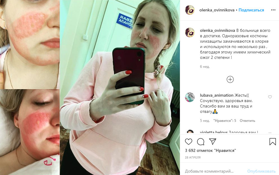 Напомним, что 28 апреля медсестра Ольга Овинникова выложила фото в социальную сеть Инстаграм, где запечатлела своё лицо с покраснениями и волдырями. Ольга рассказала, что получила ожог лица второй степени из-за того, что медицинский персонал Карабановской больницы вынужден носить средства индивидуальной защиты по несколько раз. Перед каждым повторным использованием маски и костюмы вымачиваются в растворе хлора.