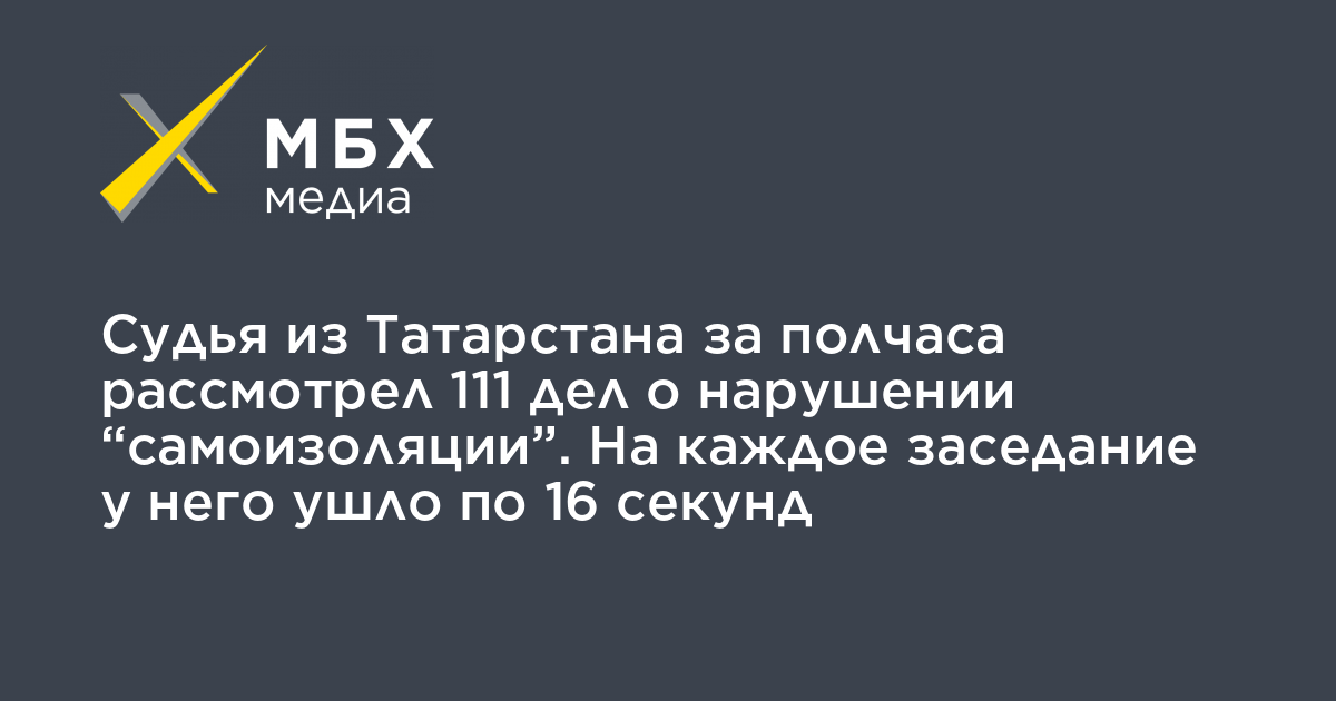 Заместитель председателя Набережночелнинского городского суда Татарстана Ленар Хасимов 27 мая в промежутке между 14:00 и 14:30 рассмотрел 111 дел о нарушении режима «самоизоляции» (ст. 20.6.1 КоАП). На одно рассмотрение в среднем у него ушло 16 секунд. Об этом сообщается в совместном исследовании «Важных историй» и «Холода».