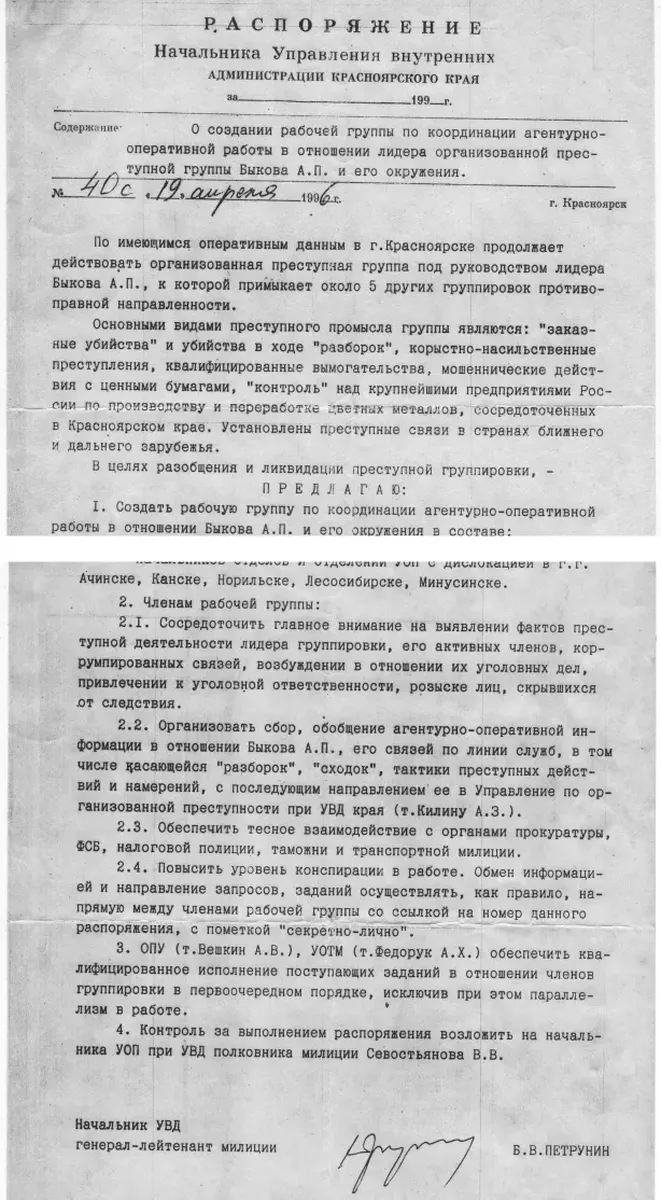 Пока еще нет понятия «оргпреступное сообщество «Красноярское», оно появится применительно к быковцам в 1997-м, а еще через два года в МВД его назовут «самым сильным в России». Пока менты говорят (и спустя несколько месяцев, весной 1996-го, это появится и в документах) об «оргпреступной группировке (группе) Быкова А. П., к которой примыкает около 5 других группировок противоправной направленности».