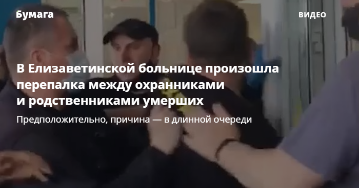 У Елизаветинской больницы 15 июня произошел конфликт между охранниками и родственниками пациентов. О происшествии рассказали в соцсетях, информацию «Бумаге» подтвердили в пресс-службе больницы.