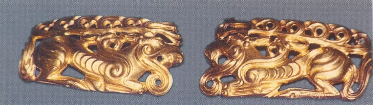 Золотые бляхи в виде лежащих оленей, украшавшие пояс «золотого человека». Южный
