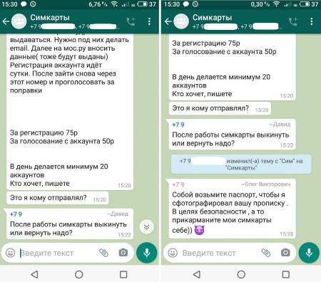 Желающих заработать набирают через чат в WhatsApp. За каждую регистрацию на сайте обещают платить по 75 рублей, за каждый голос за поправки - по 50 рублей.