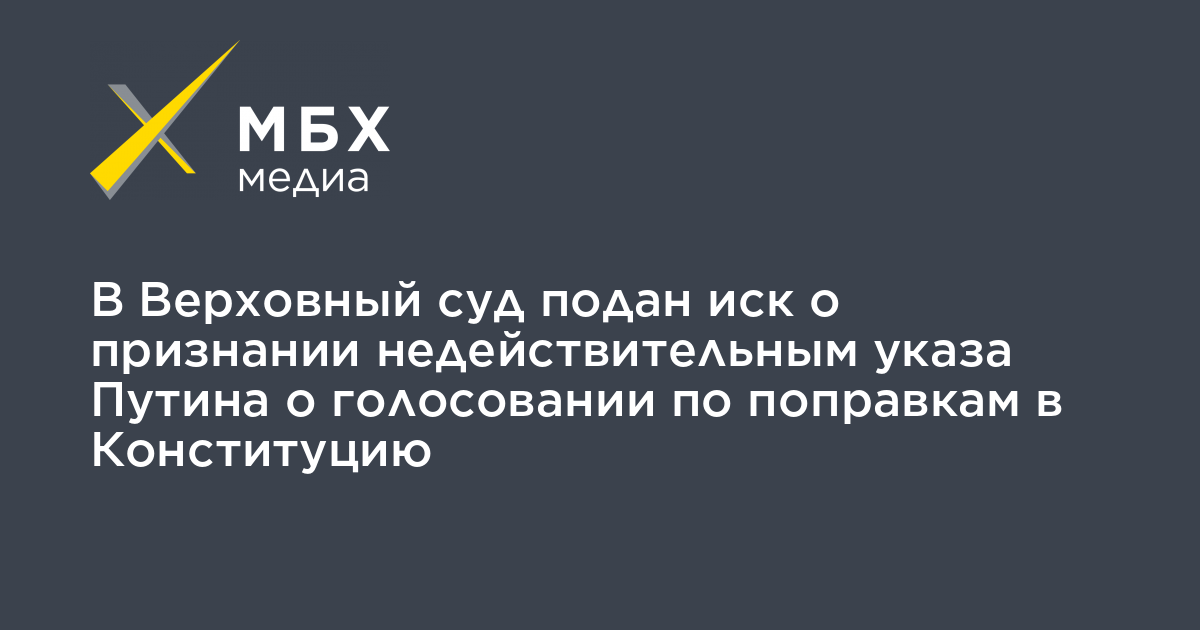 Депутаты Мосгордумы Евгений Ступин, Олег Шереметьев и политолог Валерий Соловей подали в Верховный суд иск с требованием признать недействительным указ Владимира Путина о назначении голосования по поправкам в Конституцию на 1 июля. Об этом «МБХ медиа» сообщил Ступин.