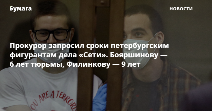Прокурор Александр Василенко попросил признать виновными петербургских фигурантов дела «Сети» — сообщества, признанного террористическим и запрещенного в России. По мнению стороны обвинения, Виктору Филинкову нужно назначить 9 лет лишения свободы в колонии общего режима, Юлию Бояршинову — 6 лет. Это следует из видеотрансляции заседания суда.