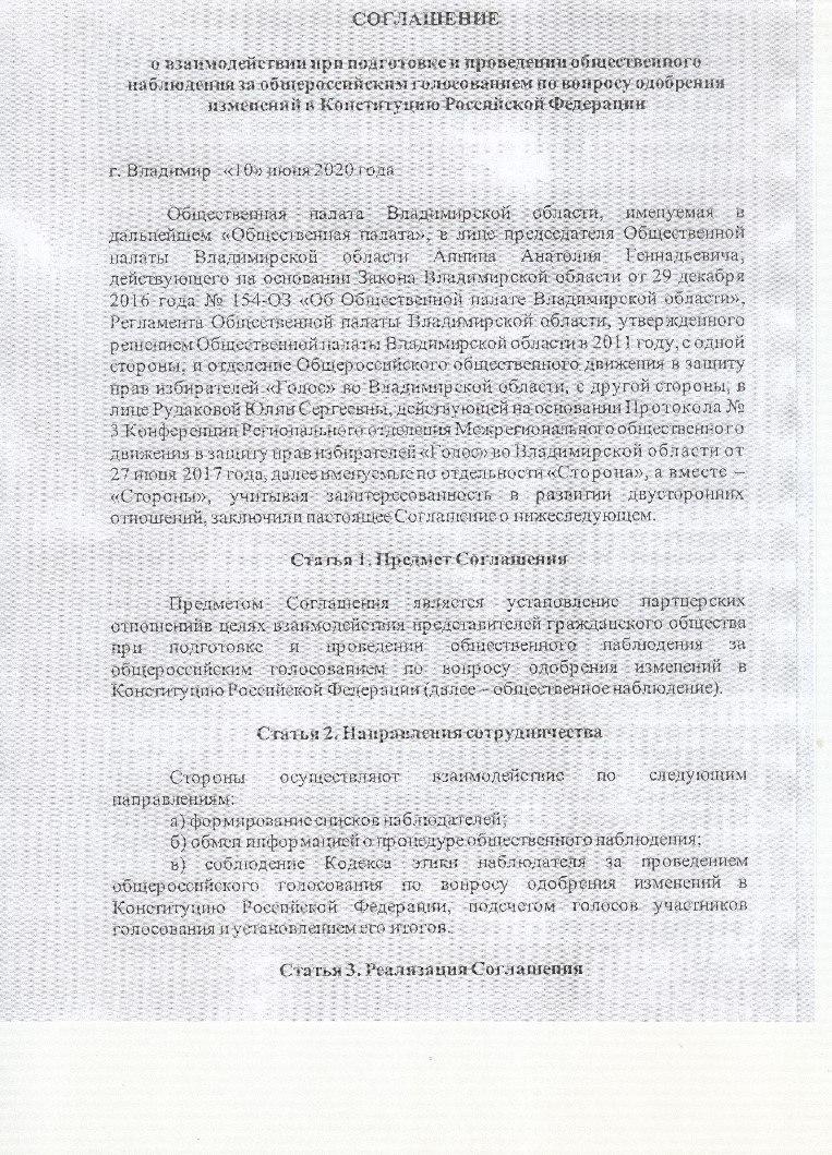Владимирское отделение движения в защиту прав избирателей “Голос” подписало соглашение с областной Общественной палатой о наблюдении за голосованием по поправкам к Конституции. Об этом сообщила председатель владимирского отделения Юлия Рудакова в социальных сетях.