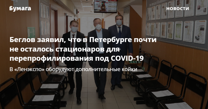По словам губернатора, Петербург «практически дошел до уровня, когда переоборудовать другие стационары уже нельзя», цитирует его «Интерфакс». Беглов объяснил это тем, что у петербуржцев есть и другие заболевания. Из-за этого в городе начинают перепрофилировать часть павильонов «Ленэкспо» для больных коронавирусом средней тяжести. По данным «Интерфакса», там в общей сложности вскоре будет 2,5 тысячи коек для пациентов с COVID-19.