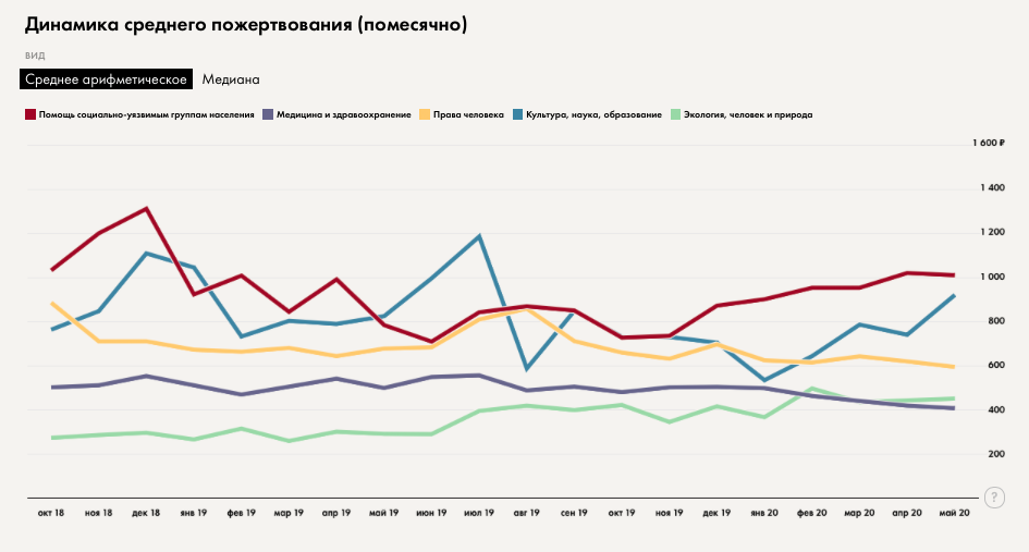 «Рост помощи социально уязвимым группам населения начался в марте 2020 года. В мае рывок закончился, число пожертвований снизилось. При этом продолжает расти помощь медицинским организациям. И общая тенденция все равно хорошая. Мы как инфраструктурная организация подходили к весне с опаской, что все обвалится из-за пандемии и кризиса. Но мы и коллеги начали объединять усилия, говорить о том, что социальные проблемы на карантин не уходят. И это дало свои результаты, начался рост пожертвований». Елизавета Язневич, руководителя отдела исследований благотворительного фонда «Нужна помощь».