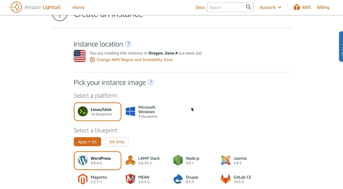 Внутри Lightsail можно создать так называемый инстанс (instance) – виртуальный сервер, на который затем установить операционную систему Linux или Windows. На этом шаге можно выбирать – ставить только операционную систему или и систему, и приложение (например, WordPress).