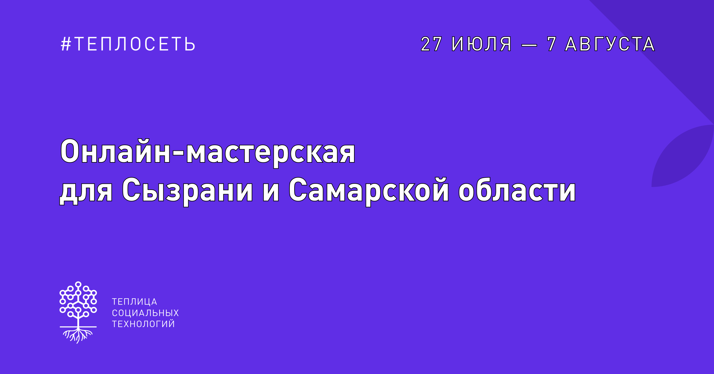 Команда Теплицы социальных технологий проведет онлайн-мастерскую Теплосети для активистов из Сызрани и Самарской области c 27 июля по 7 августа 2020 года. Участников ждут лекционные и практические занятия с Софьей Жуковой, руководителем отдела фандрайзинга фонда «Нужна помощь», Анастасией Раца, SMM-специалистом Гринпис России, и специалистами Теплицы.