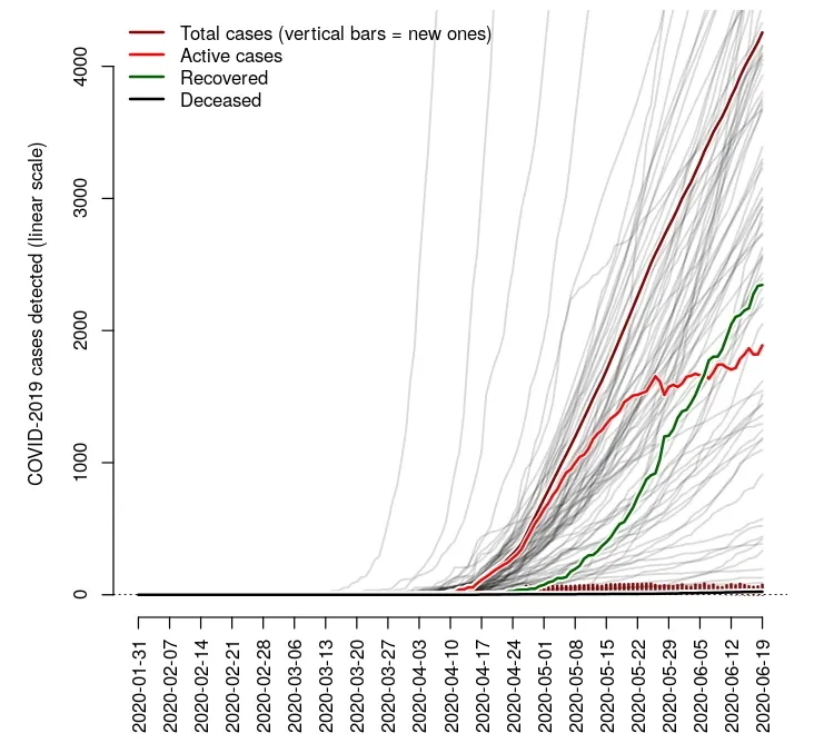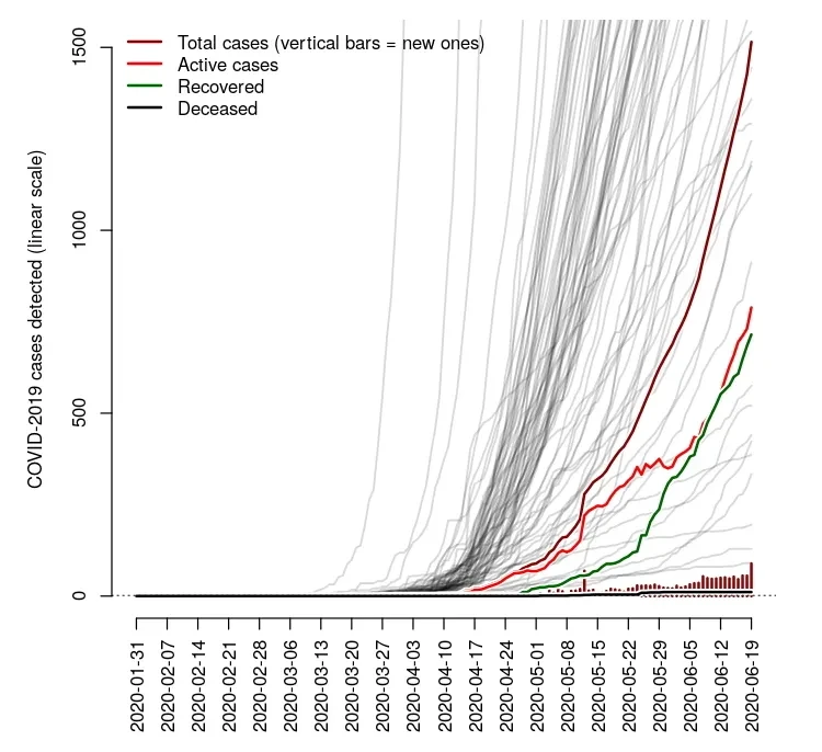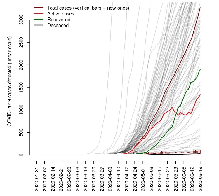 Бордовая кривая — всего случаев, красная — зараженных в настоящее время, зеленая — вылеченных пациентов. Бордовые столбики по оси X — дневной прирост новых случаев заражения.