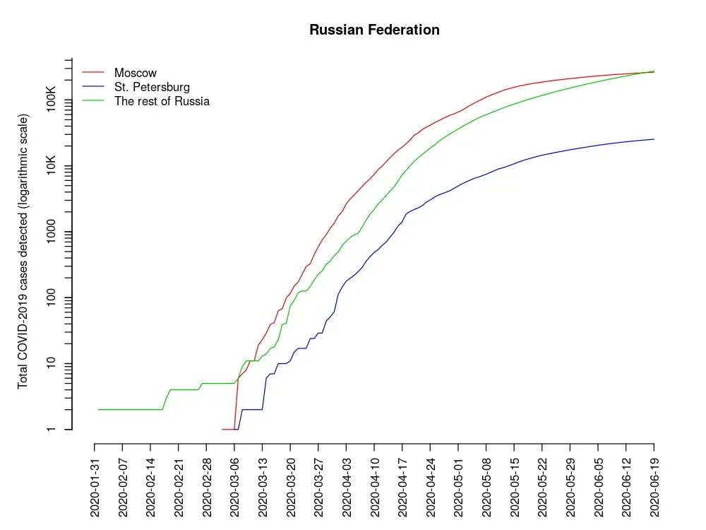 Из опубликованных выпускником физтеха Виктором Кабановым графиков следовало, что существенного снижения заболеваемости не наблюдается как минимум в 39 регионах. «Это минимальная оценка, я откинул все регионы, данные по которым вызывали сомнения», — комментирует Кабанов. Его картина эпидемии получилась по меньшей мере в три раза менее оптимистичной, чем у главы Роспотребнадзора.