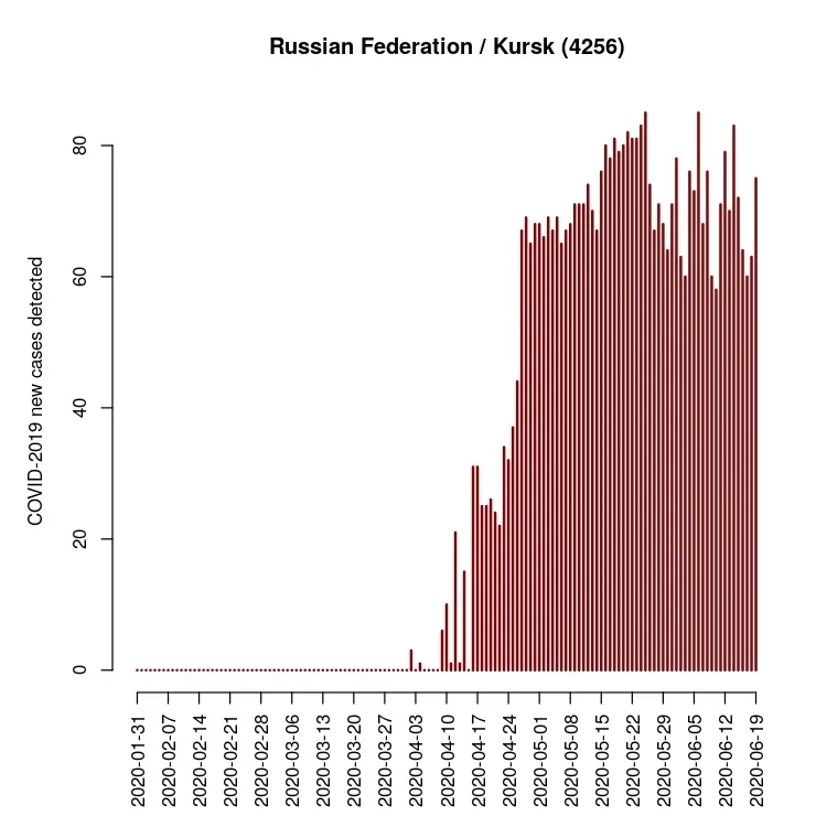 По данным Алексея Куприянова, ситуация в Курской области стабильно тяжелая: наблюдается медленный рост заболеваемости, власти пытаются взять ее под контроль, но пока не выходит. Динамика смертности неясна, так как зарегистрировано слишком мало случаев. Качество данных из региона вызывает у эксперта сомнения.
