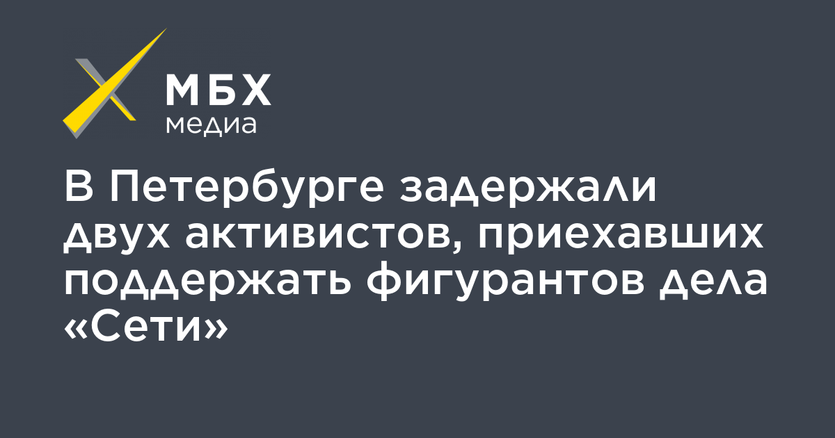 В Петербурге задержали двух активистов, приехавших поддержать фигурантов дела «Сети». Об этом «МБХ медиа» рассказал один из задержанных, автор телеграм-канала «Протестный МГУ» Дмитрий Иванов. Также полицейские задержали автора телеграм-канала Avtozak LIVE Максима Кондратьева.