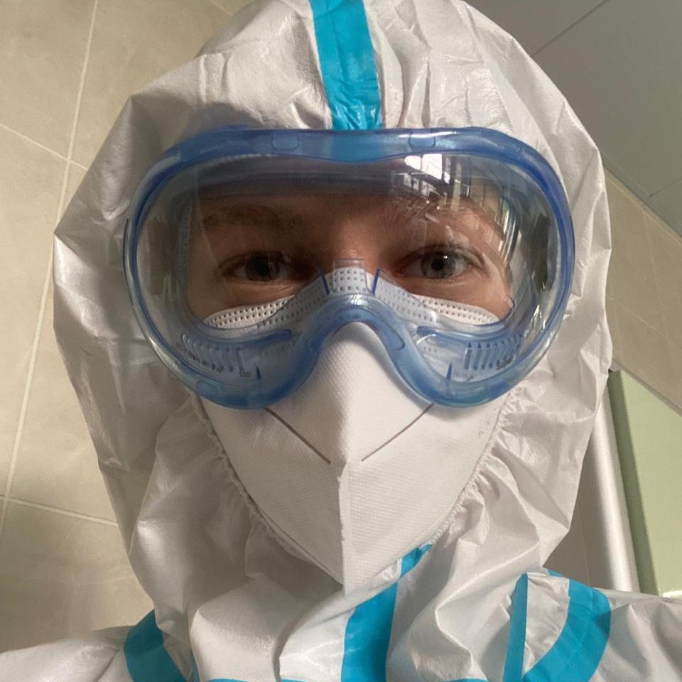 Первый день было страшно. Я пришла туда и ничего не понимала. Мне помогла девушка, все рассказала, и дальше все было временем взаимовыручки и взаимопомощи. У нас было максимальное снабжение, всегда были СИЗы, респираторы, чистые маски и специальные люди, добровольцы, которые дежурили по 24 часа и проверяли нашу изоляцию, обматывали руки, ноги. У нас был даже сленг для этого: проскотчевать. Нас всех скотчевали качественно. И еще были специальные люди, которые помогали раздеваться после смены в 12 часов. Надо им всем отдать должное.