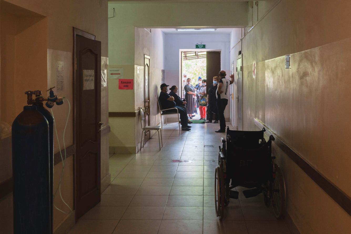 Коротко стриженный человек с комплектом вещей в бумажном пакете сидит ссутулившись на оранжевой клеенке в коридоре районной больницы. К лицу тянется пластиковая трубка от кислородного аппарата. Вот уже два часа он ожидает госпитализации с ковид-пневмонией. Посреди коридора на пол наклеен листок бумаги с надписью «Красная зона».