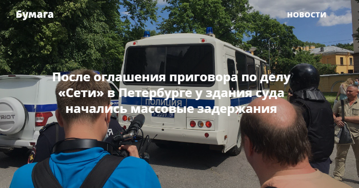 У здания 2-го Западного окружного военного суда после оглашения приговора петербургским фигурантам дела «Сети*» начались задержания. Как сообщает корреспондент «Бумаги», были задержаны до 30 человек.