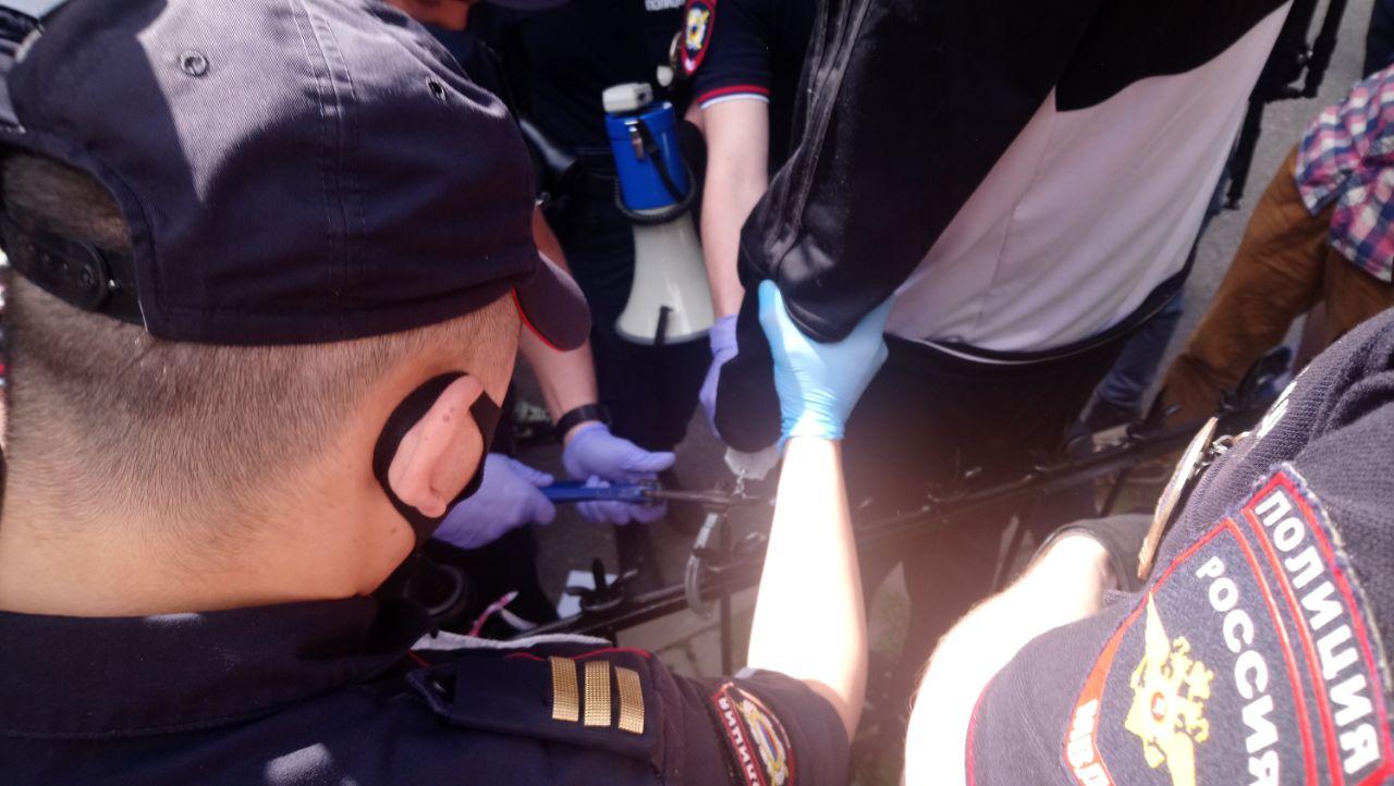 Полиция пыталась его задержать, но не могла открыть наручники. Через несколько минут активиста задержали и увезли.