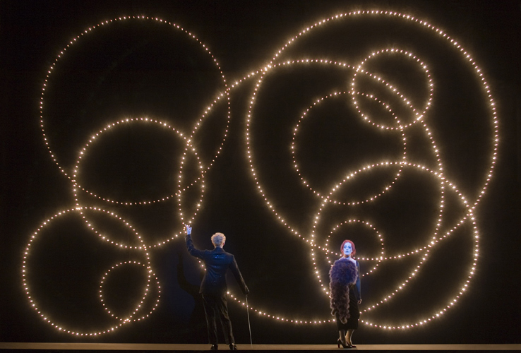 © Роман Должанский «Берлинер ансамбль» Судя по всему, большинство зрителей в этот вечер, как и я, смотрели спектакль Уилсона не в первый раз — мы все прощались не только со всей постановкой, но и с каждой сценой, с каждым зонгом, с каждым памятным моментом. А спектакль из таких вот незабываемых эпизодов и состоит — начиная с пролога, когда на занавесе возникает светящийся кружок, такой же, как крутящаяся эмблема «Берлинер ансамбля» над башенкой театра на Шиффбауэрдамм, потом проявляется еще один круг, потом еще, и вот уже пересекающиеся круги с мигающими лампочками игриво и зазывно вспыхивают по всему зеркалу сцены, а персонажи Брехта пускаются в забавный парад-алле на авансцене… И заканчивая эпилогом, в котором стоящему на помосте виселицы с петлей на шее Мэкхиту приходит весть о помиловании и откуда-то с театральных небес опускается красный праздничный занавес-рамка. У Уилсона даже виселица выглядит как волшебная игрушка — это, конечно, самая красивая виселица на свете. Еще с премьеры я запомнил, как в финале Мэкки-Нож, кокетливо согнув ногу, упирается ботинком в столб этой виселицы — и в маленьком треугольничке между каблуком и подошвой виден кусочек подсвеченного задника. У Уилсона любая мелочь продумана, изящна и необходима.
