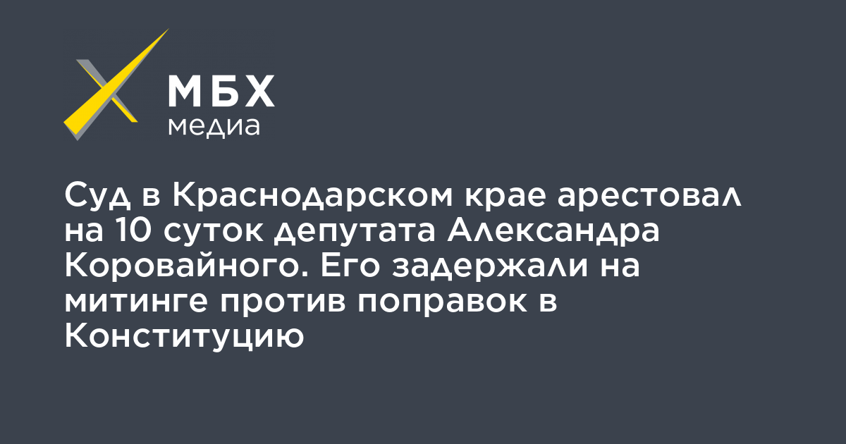 Суд в Ейске арестовал на 10 суток местного депутата Александра Коровайного, который был задержан накануне на митинге против поправок в Конституции. Об этом сообщил «МБХ медиа» координатор «Правозащиты Открытки» Алексей Прянишников.
