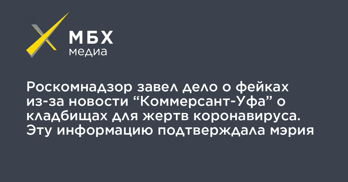 Управление Роскомнадзора по республике Башкортостан завело административное дело о распространении фейковых новостей (часть 9 статьи 13.15 КоАП) из-за статьи издания «Коммерсант-Уфа» о местах для умерших от коронавируса, которую подтверждала мэрия города. Определение о возбуждении дела есть в распоряжении «МБХ медиа».