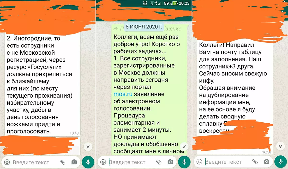 «В нашей управляющей компании по эксплуатации многоквартирных домов устный приказ по поводу регистрации и онлайн голосованию идет напрямую от управы района. Заставляют обзванивать жителей и агитировать их голосовать онлайн или прикрепляться к участку района», — рассказала читательница «МБХ медиа» из Москвы, которая попросила сохранить анонимность.