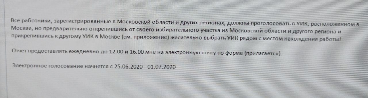 Работника также могут попросить взять открепительное удостоверение и проголосовать по месту работы. Анонимный источник «МБХ медиа» в МФЦ рассказал, что его и его коллег просили предоставить номера телефонов и имена трех знакомых, которые зарегистрированы на портале mos.ru. По его словам, такая просьба поступила еще в марте 2020 года, но с тех пор никаких принуждений и странных распоряжений начальства, связанных с голосованием, не было.