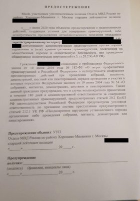 В Москве полицейский приходил к участнику акции за честные выборы 3 августа 2019 года, чтобы вручить ему предостережение «о недопустимости совершения противоправных действий» при проведении публичных мероприятий. Об этом ОВД-Инфо рассказал сам молодой человек, пожелавший остаться анонимым.