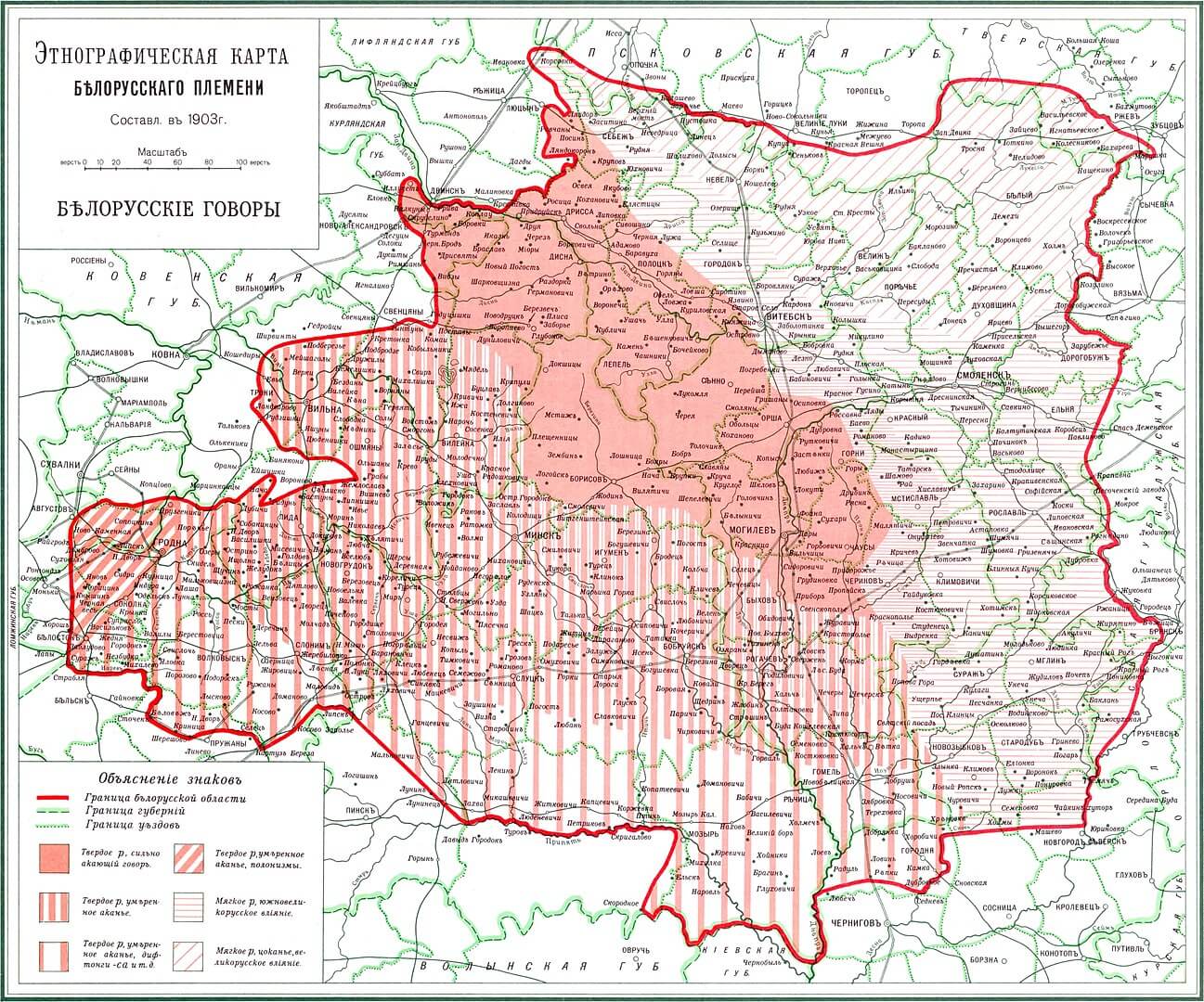 В 1903 году этнограф профессор Ефим Карский составил "Этнографическую карту белорусского племени" с обозначенной на ней "границей белорусской области" – в нее наряду с территорией современной Беларуси были, исходя из тогдашнего этнического состава населения, включены, например, Вильна (Вильнюс) с окрестностями и значительная часть нынешних Смоленской и Брянской областей РФ. Исходя из этой карты, в 1918 году руководство недолговечной Белорусской Народной Республики попыталось установить границы новорожденной страны. Гражданская война внесла свои коррективы, и "сбором" белорусских территорий занимались уже большевики, провозгласившие советскую Белоруссию в начале 1919 года. Затем они на какое-то время слили ее с Литвой – по крайней мере на бумаге, потому что реальная обстановка на фронтах менялась стремительно, – и, наконец, воссоздали БССР, но на очень небольшой территории, фактически включавшей в себя лишь Минск и Могилев с окрестностями.