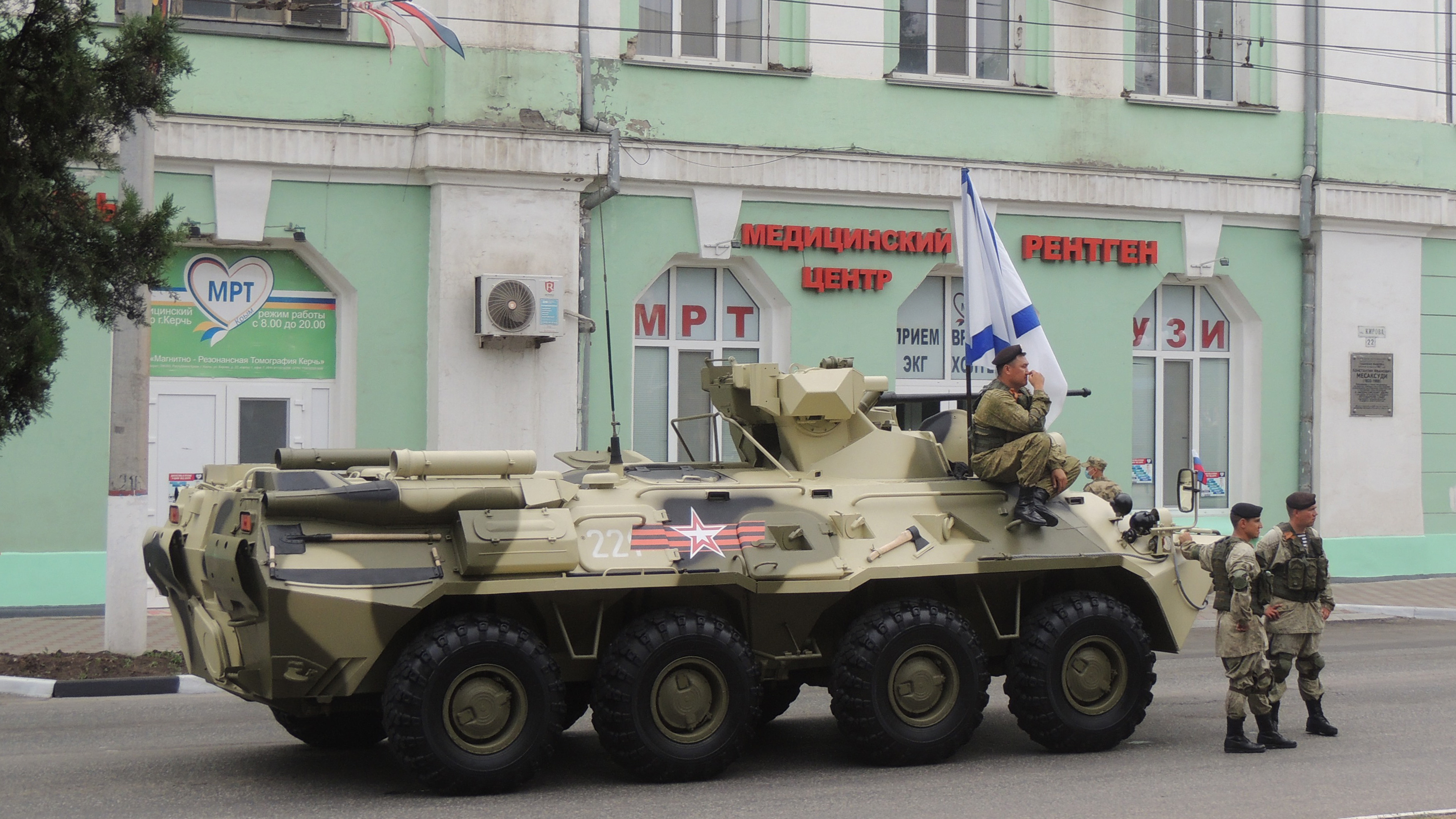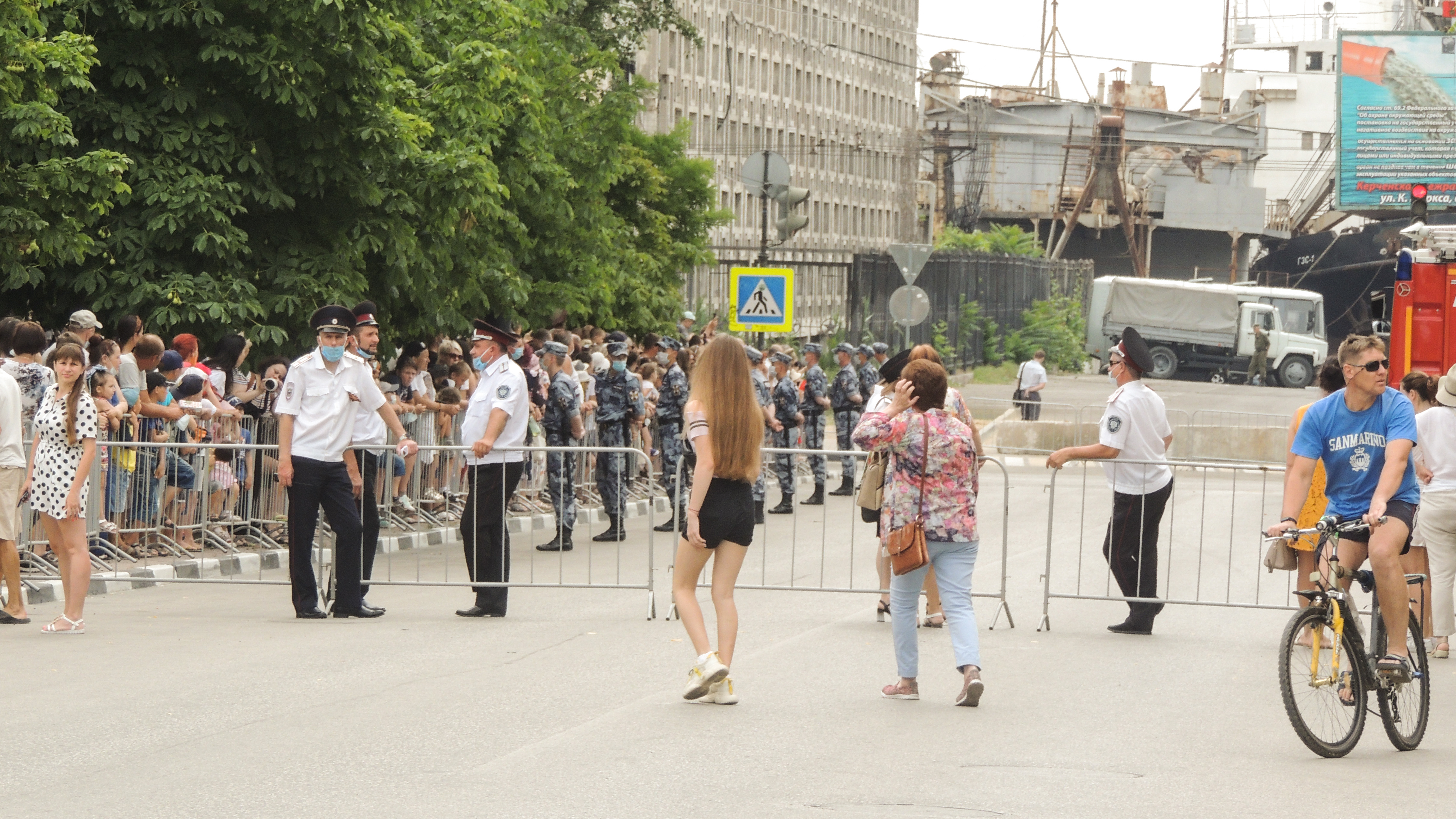 В Керчи 24 июня провели российский военный парад, приуроченный к 75-летию победы во Второй мировой войне. Людей пропускали через рамки металлодетекторов, российские полицейские проверяли наличие масок.