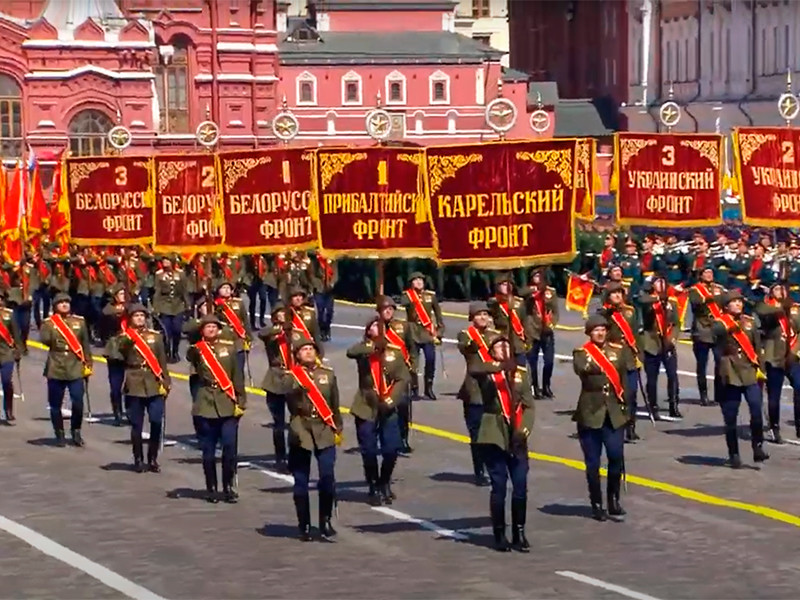 Историческую часть парада открыли знаменные группы с штандартами десяти фронтов. Затем на брусчатке появились военнослужащие в исторической военной форме пехотинцев, летчиков, моряков, инженеров, разведчиков, пограничников, прошли расчеты народного ополчения, казаков и материально-технического обеспечения. Пехотинцы несли самозарядные карабины Симонова и винтовки Мосина, пистолеты-пулеметы Шпагина и Судаева.