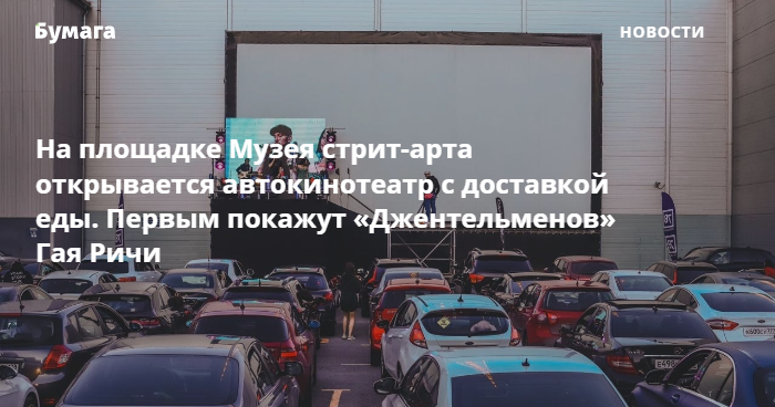 В субботу, 27 июня, на площадке Музея стрит-арта на шоссе Революции откроется автокинотеатр. Это совместный проект музея, сети кинотеатров «Мираж Синема» и ресторанной группы Italy Group. Об этом «Бумаге» сообщили в пресс-службе «Мираж Синема».