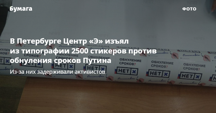 Сотрудники центра по противодействию экстремизму изъяли из типографии в Московском районе Петербурга 2,5 тысячи стикеров против обнуления сроков Владимира Путина. Об этом пишет «Фонтанка» со ссылкой на собственные источники.