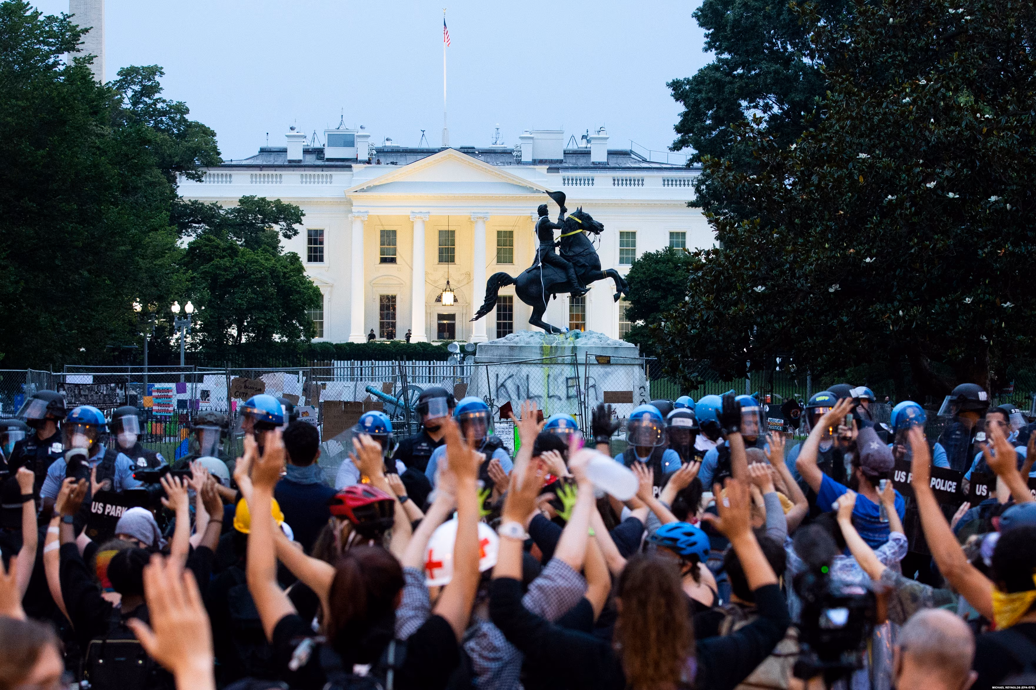 Протестующие переместились в Лафайет-парк – сквер напротив Белого дома, в центре которого стоит памятник седьмому президенту США Эндрю Джексону. Он провинился перед протестующими тем, что владел рабами и руководил депортацией индейских племен с их исконных земель.