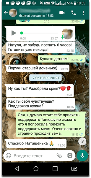 «Для меня это, конечно, было ударом. Потому что мы с ним очень близко общались. Мне было очень обидно», — говорит Наталья. Она следила глазами за потоком людей, проходящих мимо, как вдруг заметила след от синяка на челюсти у одной из женщин. Сверху лежал плотный слой тонального крема. Наталья настолько сконцентрировалась на этом синяке, что даже не расслышала слов женщины. Видела только её «запуганные глаза». Наталья давно подозревала, что эта участница страдает от домашнего насилия. Она казалась слишком зажатой и всё время тряслась. «Я их уже вижу. Достаточно посмотреть — и я понимаю: у этого человека пипец в семье», — объясняет Наталья.