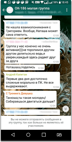Всё это время капитаны продолжали общаться со своими командами. Перед началом нового этапа Андрей написал в общий чат: «Первые два дня достаточно сложные морально в ПК (продвинутый курс). Не все выдерживают». Очень скоро Наталья в этом убедилась. Из потока в 180–200 человек на продвинутый курс осталась половина. Тренинг обошёлся каждому участнику в 54 000 рублей. На первом занятии в Московском тренинговом центре группа принимала правила. Тренер Григорий Соколов зачитывал пункты из договора, и люди поднимались со своих мест, когда соглашались с условием. «Признаёте ли вы, что не будете пить алкоголь во время тренинга?» Наталья встала. «Признаёте ли вы, что не будете употреблять наркотические вещества?» Наталья поднялась снова. «Признаёте ли вы, что не будете курить?» Наталья осталась на месте. Она курила уже двадцать лет и не планировала бросать. На базовом курсе от неё этого не требовали.