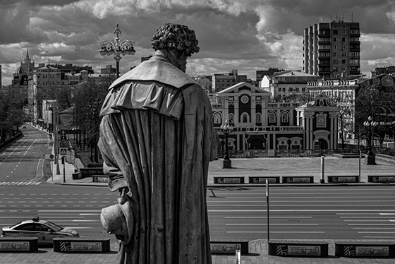 © Сергей Пономарев Сергей Пономарев. Памятник Пушкину, Пушкинская площадь, Тверской бульвар. 17 июля в Музее Москвы откроется выставка лауреата Пулитцеровской премии Сергея Пономарева «Москва. Великая пустота» — 45 черно-белых панорамных видов безлюдных улиц города в дни пандемии и самоизоляции.
