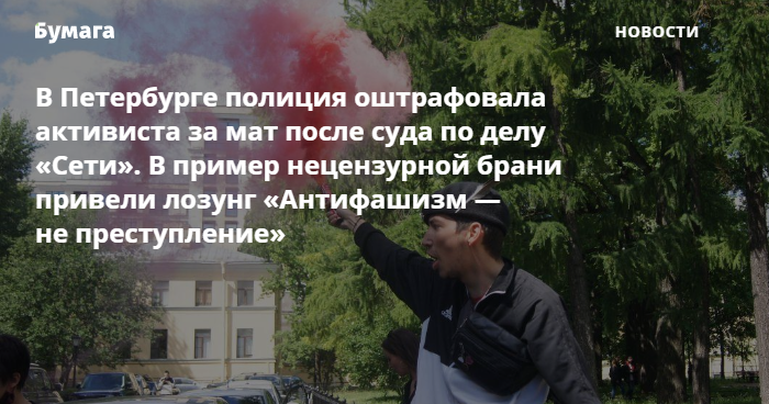 В петербургском отделе полиции № 78 выписали активисту Павлу Крисевичу штраф в 500 рублей, посчитав матом лозунг «Антифашизм — не преступление». Об этом написала «Медиазона» со ссылкой на правозащитницу Варю Михайлову.